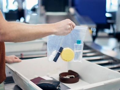Τα υγρά και τα τζελ επιτρέπονται στις χειραποσκευές εάν χωρούν σε δοχείο που δεν υπερβαίνει τις 3,4 ουγγιές, σύμφωνα με τους κανόνες της Υπηρεσίας Ασφάλειας Μεταφορών, εξηγεί.