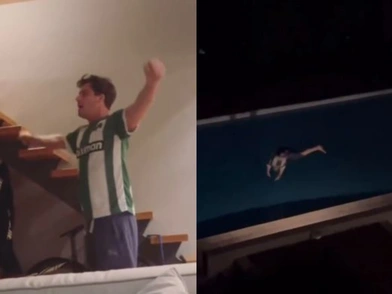 Μάλιστα, ο Αμούτζας φορώντας την φανέλα του Παναθηναϊκού βούτηξε στην πισίνα από τον ενθουσιασμό του για το γκολ του Τετέ.