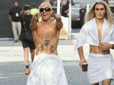 O Νταμιάνο Νταβίντ και ο Ίθαν Τόρκιο, ο τραγουδιστής και ντράμερ αντίστοιχα των Maneskin, πήγαν μια βόλτα σε κεντρικό δρόμο της Νέας Υόρκης, φορώντας λευκό μπουρνούζι και πετσέτες. Για παπούτσια επέλεξαν μαύρα ψηλοτάκουνα μποτάκια.