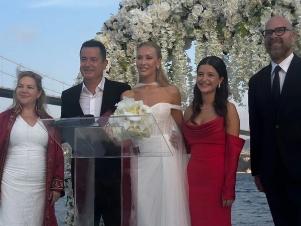 Η Χάντε Γκιουλσέν πόσταρε ένα στιγμιότυπο από τον γάμο στο οποίο βλέπουμε τον Ατζούν Ιλίτζαλι και την Ayca Cagla Altunkaya να ποζάρουν σε μια εξέδρα μπροστά σε έναν εντυπωσιακό στολισμό με λευκά άνθη και έγραψε στα τουρκικά: «Ευτυχία».