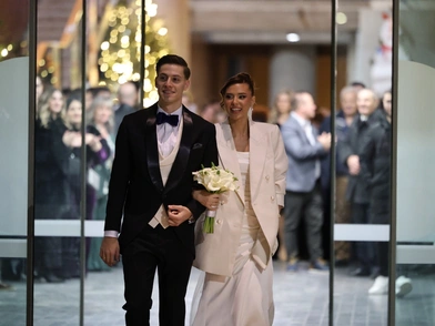 Ο διεθνής άσος του Δικεφάλου επέλεξε να φορέσει ένα σμόκιν με παπιγιόν, ενώ η σύντροφό του έφτασε στο δημαρχείο της Θεσσαλονίκης με ένα λευκό φόρεμα και σακάκι.