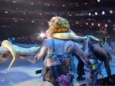 Σε αυτή την ιστορική παράσταση ανέτρεξε με ένα πρόσφατο βίντεο στο Instagram η τραγουδίστρια, γράφοντας: «Μια από τις αγαπημένες μου ερμηνείες ήταν με έναν πύθωνα αλμπίνο. Ακόμα θυμάμαι πόσο φοβισμένη ένιωσα όταν μου έδωσαν αυτό το φίδι και ανέβηκα στη σκηνή», γράφει.