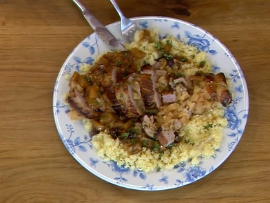 - Σε μία πιατέλα σερβιρίσματος προθέτουμε, το κουσκούς, αφαιρούμε τον σπάγκο από το ψαρονέφρι, το κόβουμε σε φέτες και το μεταφέρουμε πάνω στο κουσκούς