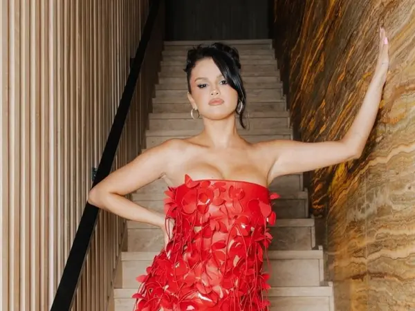 Στις φωτογραφίες της ανάρτησης η Σελένα Γκόμεζ φορά κόκκινο φόρεμα και το στυλ της έχει αέρα από παλιό Χόλιγουντ.