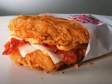Τι είναι: Σάντουιτς χωρίς ψωμί. Στη θέση του ψωμιού, δυο ζουμερές φέτες τηγανητού κοτόπουλου. Μέσα, μια τεράστια φετα μπέικον, τυρί και ντομάτα, για το ξεκάρφωμα.