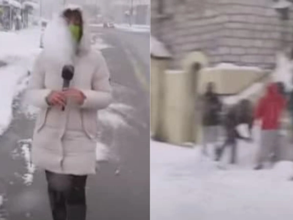Την ώρα που η δημοσιογράφος μιλούσε στην κάμερα, μια χιονόμπαλα... προσγειώθηκε στο πρόσωπό της, με την ίδια να το αντιμετωπίζει με χιούμορ.
