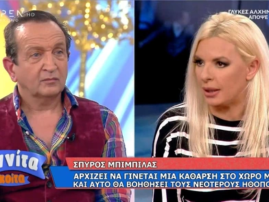 Η Αννίτα Πάνια υποδέχθηκε στο πλατό τον Σπύρο Μπιμπίλα με χαμόγελο: «Είναι ένας άνδρας τον οποίο αγαπώ και τον αγαπώ γιατί μένει παιδί. Όπως τα παιδιά όταν κάτι τα ενοχλήσει, όταν κάτι τα φρικάρει, όταν κάτι τα μπερδέψει, το λένε αμέσως, έτσι κι ο Σπύρος Μπιμπίλας φρίκαρε, το έγραψε, του έφυγε και ξαναήρθε. Έλα Σπύρο κοντά μας» είπε η παρουσιάστρια.