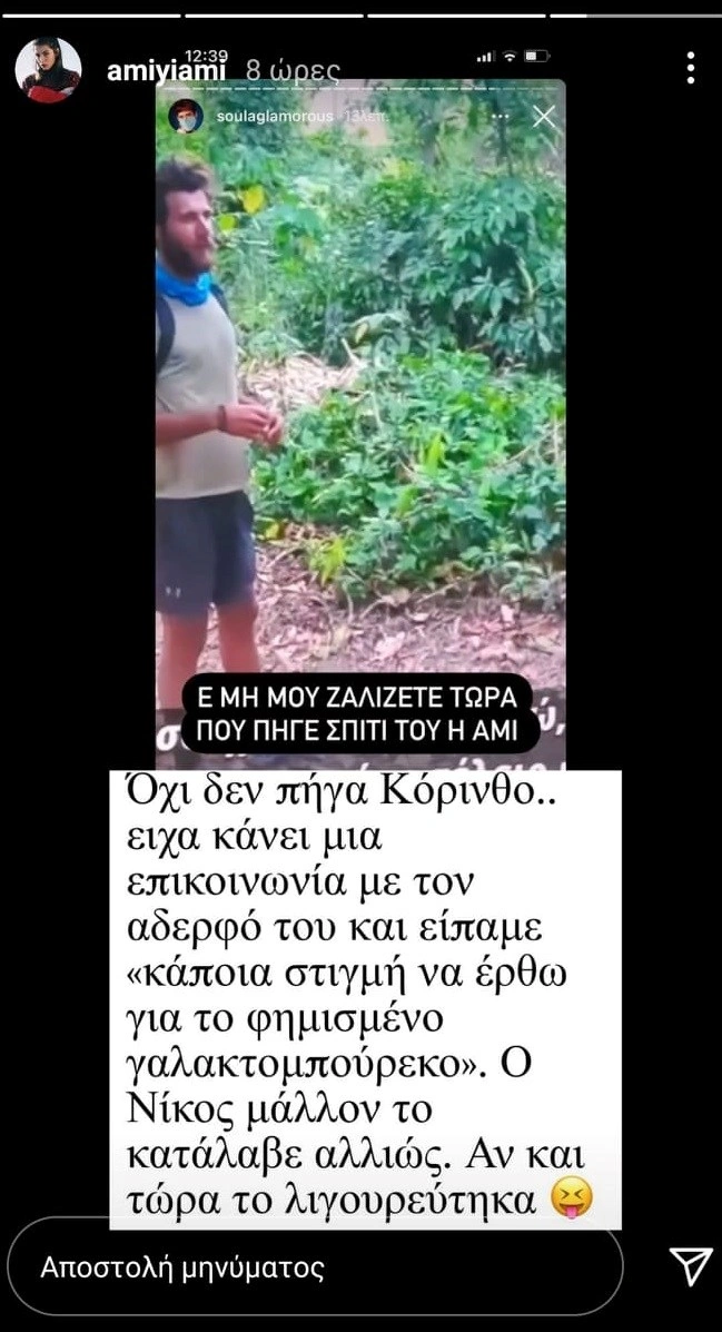 Παίρνοντας πάσα από ένα story της Soulaglamorous, η Βέλλη έγραψε ότι «όχι, δεν πήγα Κόρινθο. Είχα κάνει μια επικοινωνία με τον αδερφό του και είπαμε "κάποια στιγμή να έρθω για το φημισμένο γαλακτομπούρεκο". Ο Νίκος μάλλον το κατάλαβε αλλιώς. Αν και τώρα το λιγουρεύτηκα...»