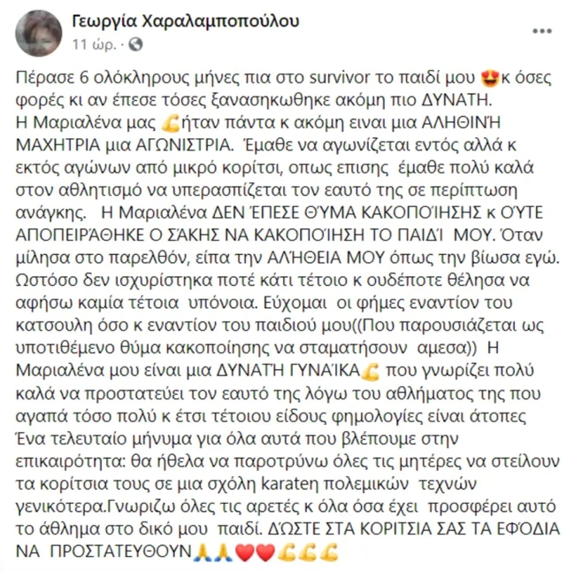 «Πέρασε 6 ολόκληρους μήνες πια στο survivor το παιδί μου και όσες φορές κι αν έπεσε τόσες ξανασηκώθηκε ακόμη πιο ΔΥΝΑΤΗ. Η Μαριαλένα μας ήταν πάντα κ ακόμη είναι μια ΑΛΗΘΙΝΉ ΜΑΧΗΤΡΙΑ μια ΑΓΩΝΙΣΤΡΙΑ. Έμαθε να αγωνίζεται εντός αλλά κ εκτός αγώνων από μικρό κορίτσι, όπως επίσης έμαθε πολύ καλά στον αθλητισμό να υπερασπίζεται τον εαυτό της σε περίπτωση ανάγκης. Η Μαριαλένα ΔΕΝ ΈΠΕΣΕ ΘΎΜΑ ΚΑΚΟΠΟΊΗΣΗΣ κ ΟΎΤΕ ΑΠΟΠΕΙΡΆΘΗΚΕ Ο ΣΆΚΗΣ ΝΑ ΚΑΚΟΠΟΊΗΣΗ ΤΟ ΠΑΙΔΊ ΜΟΥ. Όταν μίλησα στο παρελθόν, είπα την ΑΛΉΘΕΙΑ ΜΟΥ όπως την βίωσα εγώ. Ωστόσο δεν ισχυρίστηκα ποτέ κάτι τέτοιο κ ουδέποτε θέλησα να αφήσω καμία τέτοια υπόνοια. Εύχομαι οι φήμες εναντίον του Κατσουλη όσο κ εναντίον του παιδιού μου((Που παρουσιάζεται ως υποτιθέμενο θύμα κακοποίησης να σταματήσουν άμεσα))Η Μαριαλένα μου είναι μια ΔΥΝΑΤΉ ΓΥΝΑΊΚΑ που γνωρίζει πολύ καλά να προστατεύει τον εαυτό της λόγω του αθλήματος της που αγαπά τόσο πολύ κ έτσι τέτοιου είδους φημολογίες είναι άτοπες Ένα τελευταίο μήνυμα για όλα αυτά που βλέπουμε στην επικαιρότητα: θα ήθελα να παροτρύνω όλες τις μητέρες να στείλουν τα κορίτσια τους σε μια σχόλη karateη πολεμικών τεχνών γενικότερα. Γνωρίζω όλες τις αρετές κ όλα όσα έχει προσφέρει αυτό το άθλημα στο δικό μου παιδί. ΔΏΣΤΕ ΣΤΑ ΚΟΡΙΤΣΙΑ ΣΑΣ ΤΑ ΕΦΌΔΙΑ ΝΑ ΠΡΟΣΤΑΤΕΥΘΟΥΝ», έγραψε χαρακτηριστικά.