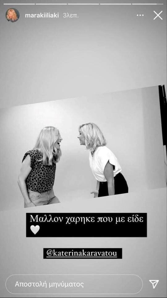 Η Μαρία Ηλιάκη επέστρεψε στην Ελλάδα και είναι έτοιμη για το νέο της τηλεοπτικό ξεκίνημα, λίγους μόλις μήνες μετά τη γέννηση της κόρης της. Η παρουσιάστρια θα βρεθεί στο πλευρό της Κατερίνας Καραβάτου στο Mega. Η Μαρία Ηλιάκη και η Κατερίνα Καραβάτου συναντήθηκαν για να κάνουν την επίσημη φωτογράφηση για την εκπομπή τους. «Μάλλον χάρηκε που με είδε» έγραψε η Μαρία Ηλιάκη στη φωτογραφία που δημοσίευσε σε story στο Instagram.