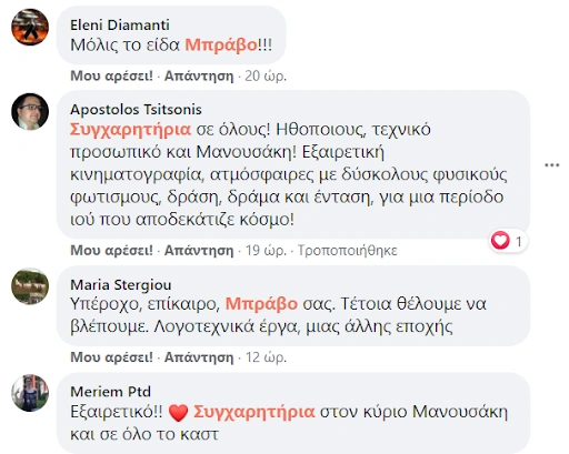Το κοινό αλλά και γνωστοί κριτικοί υποδέχτηκαν με ενθουσιώδεις αναρτήσεις όχι μόνον την εκπληκτική αποτύπωση της εποχής από το γνωστό σκηνοθέτη, αλλά και τις ερμηνείες της Ρένιας Λουιζίδου, του Γιώργου Σαββίδη, του Παύλου Κουρτίδη, ενώ δεκάδες σχόλια γράφηκαν και για την παρθενική εμφάνιση της Τζένη Καζάκου, που είναι η εγγονή του Κώστα Καζάκου και της Τζένης Καρέζη.
