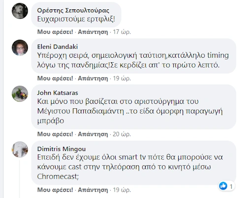 «Υψηλής αισθητικής σειρά. Μόλις είδα το πρώτο επεισόδιο και εναγωνίως περιμένω τη συνέχεια. Λίγες φορές η τηλεόραση μας κόβει την ανάσα. Εκπληκτική Ρένια Λουιζίδου, φόρεσε το ρόλο της. Συγχαρητήρια σε όλους τους συντελεστές. Δικαιούμαστε επιτέλους λίγη ποιότητα!».