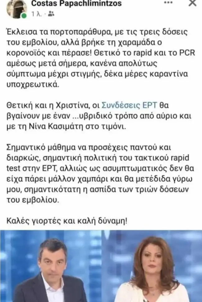 Σύμφωνα με τον Κώστα Παπαχλιμίντζο, ο ίδιος είχε κάνει και τις τρεις δόσεις του εμβολίου όμως «βρήκε τη χαραμάδα ο κορονοϊός και πέρασε».