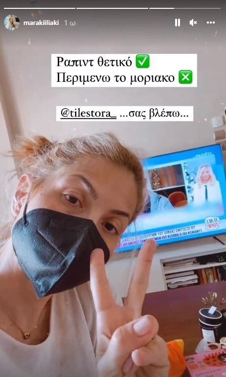 Λίγο αργότερα η Μαρία Ηλιάκη ανέβασε ένα Story στο Ιnstagram, από το σπίτι της, με τη μάσκα να παρακολουθεί την εκπομπή «Τι Λες Τωρα!». «Rapid θετικό. Περιμένω το μοριακό», έγραψε η Μαρία Ηλιάκη.