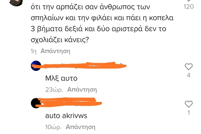 Στο βίντεο που ανέβασε ο λογαριασμός του Survivor στο Tik Tok, το πρώτο σχόλιο, το οποίο έχει συγκεντρώσει τα περισσότερα likes αναφέρεται στον τρόπο με τον οποίο ο αγρότης πιάνει την Μυριέλλα. «Ότι την αρπάζει σαν άνθρωπος τον σπηλαίων και την φιλάει και πάει η κοπέλα τρία βήματα δεξιά και δύo αριστερά δεν θα το σχολιάσει κανείς;», ανέφερε ένας χρήστης, με κάποιους από κάτω να συμφωνούν και άλλους 120 να πατούν «καρδιά».