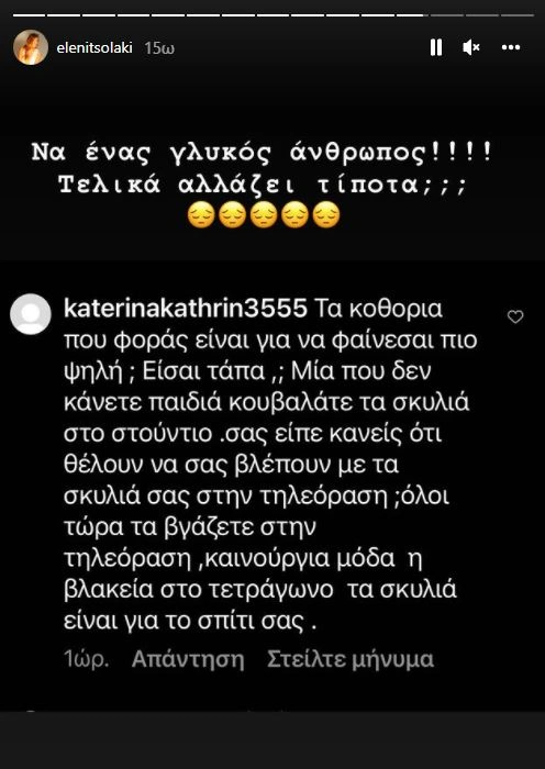 Η παρουσιάστρια πόσταρε το παραπάνω σχόλιο, σχολιάζοντας με χιούμορ «να ένας γλυκός άνθρωπος. Τελικά αλλάζει τίποτα;;;», με την απογοήτευσή της να είναι φανερή.