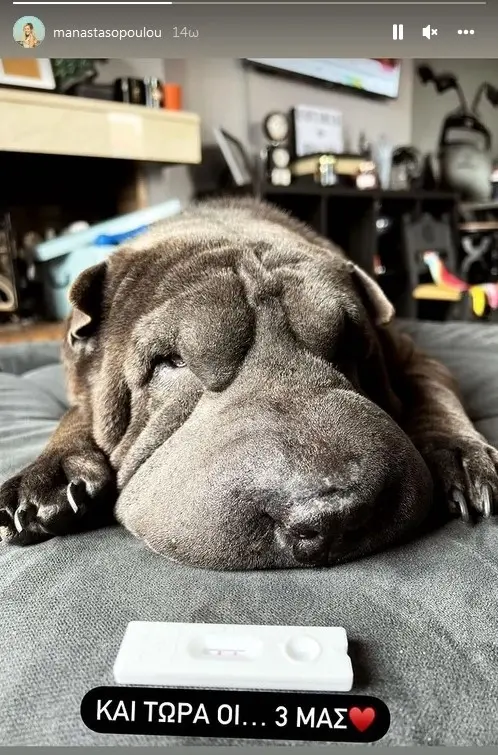 Στην ανάρτησή της είναι ο σκύλος της, Σωτήρης, ο οποίος είναι ξαπλωμένος στο χαλί του σπιτιού και μπροστά του φαίνεται το θετικό self test της δημοσιογράφου. «Και τώρα οι… 3 μας» έγραψε στη λεζάντα.