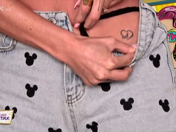 Η Μαρία Αντωνά κατέβασε το σορτς της στον αέρα της εκπομπής και έδειξε το τατουάζ που έχει χαμηλά στην κοιλιά της, σε σχήμα καρδιάς, με το «Α» μέσα σε αυτή. «Το ίδιο έχει και ο Άρης από αυτή την πλευρά, αλλά με το “Μ” μέσα. Τι άλλο θα κάνω για αυτή την εκπομπή;» είπε χιουμοριστικά η Μαρία Αντωνά.