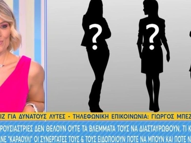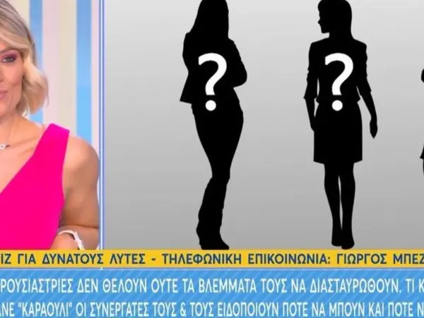 Ενα κουίζ για πολύ δυνατούς λύτες έδωσε η εκπομπή της Ελεονώρας Μελέτη το πρωί της Πέμπτης (9/6), αποκαλύπτοντας τον «εμφύλιο» που έχει ξεσπάσει σε τηλεοπτικό σταθμό. Ούτε βλέμμα μεταξύ τους δεν θέλουν να ανταλλάσσουν τρεις παρουσιάστριες πρώτης γραμμής μεγάλου καναλιού, σύμφωνα με το ρεπορτάζ από την εκπομπή «Mega Καλημέρα». Μάλιστα τα καμαρίνια τους βρίσκονται στον ίδιο διάδρομο κι έτσι, προκειμένου η μία να μην συναντήσει την άλλη, βάζουν τους συνεργάτες τους να στήνουν... καραούλι!