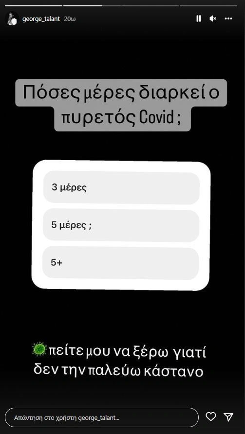 Ο ίδιος θέλησε να μάθει μέσα από σχετικό story του στο Instagram πόσες μέρες διαρκεί ο πυρετός - και κατ’ επέκταση η ταλαιπωρία - αφού όπως έγραψε χαρακτηριστικά «δεν τη παλεύει κάστανο».