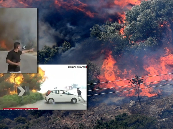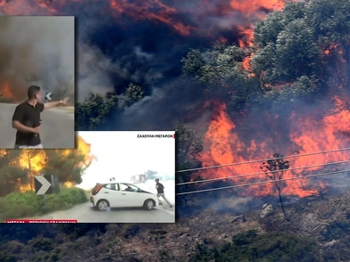 Ενώ ο ρεπόρτερ κάλυπτε τις προσπάθειες των πυροσβεστών όταν η φωτιά από πίσω του φούντωσε και τα πεύκα λαμπάδιασαν σε δευτερόλεπτα, ενώ ο κάμεραμαν ξεκίνησε να τρέχει. «Νίκο μπες μέσα στο αμάξι γρήγορα» είπε ο Μίλτος Σακελλάρης και οι δυο τους έφυγαν γρήγορα με το αυτοκίνητο.