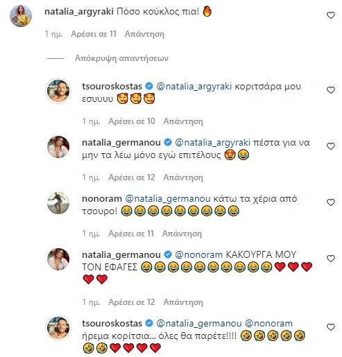 Σε ανάρτηση λοιπόν που έκανε ο Κώστας Τσουρός η Ναταλία Αργυράκη, η οποία συμμετέχει στην εκπομπή «Καλύτερα δεν γίνεται» σχολίασε το πόσο κούκλος είναι με τη Ναταλία Γερμανού να συμπληρώνει «πέστα για να μην τα λέω μόνο εγώ επιτέλους».