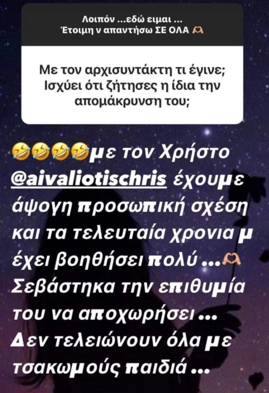 H Κατερίνα Καινούργιου απολαμβάνει τις καλοκαιρινές της διακοπές πριν επιστρέψει στις επαγγελματικές της υποχρεώσεις και είναι πολύ ενεργή στα social media, κάνοντας μάλιστα Q&A με τους ακολούθους της στο Instagram. Μετά τις απαντήσεις που έδωσε για την προσωπική της ζωή και τον χωρισμό της με τον Φίλιππο Τσαγκρίδη, η παρουσιάστρια απάντησε και σε ερώτηση για τα επαγγελματικά της. Συγκεκριμένα οι followers της θέλησαν να μάθουν γιατί αποχώρησε από την εκπομπή της στον Alpha ο μέχρι πρότινος αρχισυντάκτης της Χρήστος Αϊβαλιώτης.
