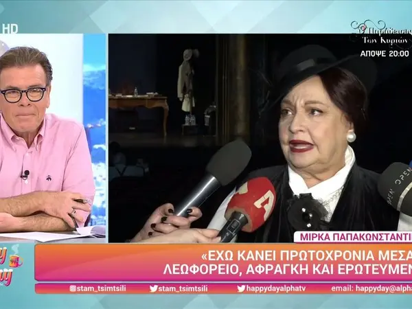 Η ηθοποιός Μίρκα Παπακωνσταντίνου, με αφορμή τη θεατρική παράσταση «Το έκτο πάτωμα» στο θέατρο Ακροπόλ, παραχώρησε δηλώσεις στις τηλεοπτικές κάμερες και τους δημοσιογράφους των ψυχαγωγικών εκπομπών. Η ηθοποιός κλήθηκε να σχολιάσει τη θεατρική επιστροφή του Γιώργου Κιμούλη αλλά και την υγεία του Δάνη Κατρανίδη.