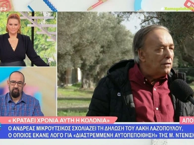 Σε ό,τι αφορά τα καινούρια σχόλια του Λάκη Λαζόπουλου προς τη Μιμή Ντενίση, ο παρουσιαστής είπε πως διαφωνεί, και το θεωρεί λάθος. «Έχει τόσα δικά του προβλήματα να λύσει, δεν αντιλαμβάνομαι γιατί άνοιξε πάλι το θέμα με τη Μιμή. Είναι λίγο βιαιοπραγικό» σημείωσε. Αναφορικά με τον Νίκο Μουτσινά που όπως όλα δείχνουν ολοκληρώνει αυτή τη σεζόν την εκπομπή του, ο Ανδρέας Μικρούτσικος δήλωσε πως η εκπομπή δεν σημειώνει τα καλύτερα νούμερα ωστόσο ο Νίκος Μουτσινάς «κάνει κάτι που είναι μοναδικός». «Δεν αφήνεις τον Μουτσινά να φύγει από το κανάλι σου με τίποτα!» τόνισε.