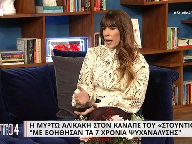 Η δημοφιλής ηθοποιός, Μυρτώ Αλικάκη, ήταν η σημερινή καλεσμένη του «Στούντιο 4» με τη Νάνσυ Ζαμπέτογλου και Θανάση Αναγνωστόπουλο και αναφέρθηκε, μεταξύ άλλων, για την ψυχανάλυση, η οποία και της άλλαξε τη ζωή και ήταν από τους σημαντικότερους ανθρώπους ο ψυχαναλυτής της, αλλά και για τα παιδιά της, ένα εκ των οποίων συμμετέχει και στη δημοφιλή σειρά «Έτερος Εγώ». Η ίδια παραδέχθηκε, μάλιστα, ότι μέχρι μία συγκεκριμένη ηλικία δεν μπορούσε να αντιληφθεί αλλά και να αναλύσει τι ακριβώς της συμβαίνει.