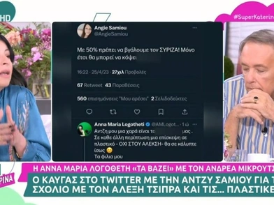 Ένταση δημιουργήθηκε στον «αέρα» της εκπομπής «Super Κατερίνα» με... πρωταγωνιστές τον Ανδρέα Μικρούτσικο και την καλεσμένη Άννα Μαρία Λογοθέτη. Αφορμή στάθηκε η διαδικτυακή αντιπαράθεση που είχε η δεύτερη με την Άνζτυ Σαμίου σχετικά με τον πρόεδρο του ΣΥΡΙΖΑ, Αλέξη Τσίπρα.