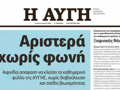 Σήμερα Τρίτη 25 Ιουνίου 2024 στις 4 το απόγευμα στα γραφεία της Αυγής στην οδό Δεληγιώργη, αιφνιδιαστικά και χωρίς καμιά διαβούλευση, μας ανακοινώθηκε ότι το καθημερινό φύλλο της εφημερίδας της Αριστεράς που εκδίδεται από το 1952, δεν θα κρεμιέται πλέον στα περίπτερα. Η μόνη άλλη περίοδος που συνέβη αυτό ξανά ήταν μία και γνωστή στην ιστορία: στη χούντα.