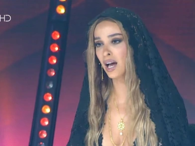 Η Ελένη Φουρέιρα ντύθηκε στα μαύρα με αποκαλυπτικό top και ολοκληρώνοντας το outfit φορώντας ένα μαύρο πέπλο από δαντέλα στο κεφάλι. Ήταν ζήτημα μερικών λεπτών από την εμφάνισή της στη οθόνη μέχρι να πλημμυρίσει το Twitter από σχόλια τηλεθεατών.