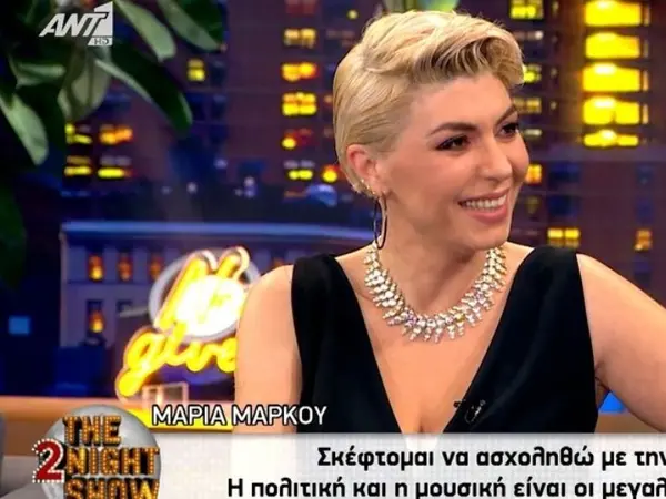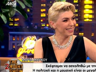«Σκέφτομαι να ασχοληθώ με την πολιτική. Η πολιτική και η μουσική είναι οι μεγαλύτερες αγάπες μου» είπε η Μαρία Μάρκου. «Θεωρώ ότι πέρα από τη μουσική και η πολιτική, επίσης, είναι η φυσική μου κλίση. Θεωρώ τον εαυτό μου φουλ πολιτικό ον, κατά την Αριστοτέλεια λογική».