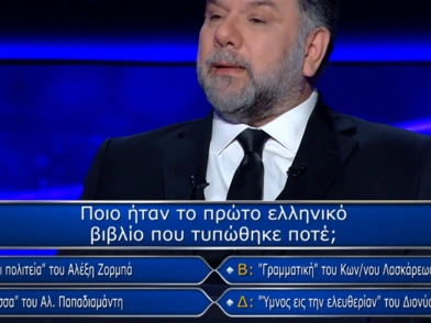 Μία προτεινόμενη απάντηση σε ερώτηση στο «Ποιος θέλει να γίνει εκατομμυριούχος» προκάλεσε αντιδράσεις στα social media καθώς ήταν λανθασμένη ή για την ακρίβεια δεν αποδόθηκε όπως θα έπρεπε. Στο επεισόδιο που έπαιξε στην τηλεόραση την περασμένη Παρασκευή ο παίκτης που συμμετείχε κλήθηκε να απαντήσει, για τα 10.000 ευρώ, στην ερώτηση «Ποιο ήταν το πρώτο ελληνικό βιβλίο που τυπώθηκε ποτέ».