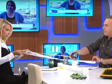 «Ένα μέτρο. Είναι ένα μέτρο;», του απάντησε εκείνη. Τότε ο παρουσιαστής άπλωσε το ψηφοδέλτιο στο τραπέζι και μέτρησε με το μέτρο το συνολικό του μήκος.
