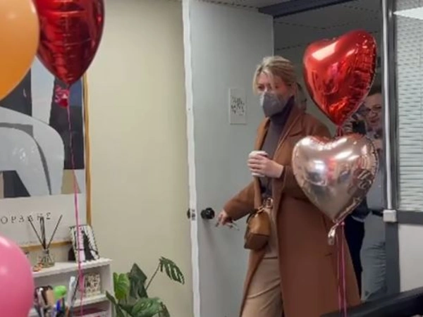 Έναν μήνα μετά, η πρώτη μέρα στο γραφείο συνοδεύτηκε από μηνύματα αγάπης από τους συναδέλφους της που γέμισαν το γραφείο με μπαλόνια και καρδιές. Η δημοσιογράφος δεν έκρυψε την έκπληξή της όταν άνοιξε την πόρτα.