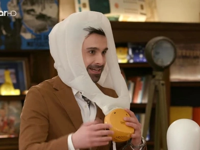 «Το φοράς στο κεφάλι και από την υποδοχή, βάζεις τη θήκη, πατάς το κουμπί, φουσκώνει και στεγνώνει το μαλλί με φυσικό τρόπο» είπε ο εκτιμητής του Cash or Trash, που το κοστολόγησε στα 60 ευρώ.