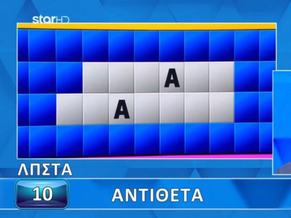 Η κατηγορία ήταν «Αντίθετα», αρχικά το μόνο γράμμα που άνοιξε σε δύο τετράγωνα ήταν το «Α» για να ακολουθήσουν το «Ο» και το «Ρ» με συνολικά μόλις τέσσερα παράθυρα να ανοίγουν.