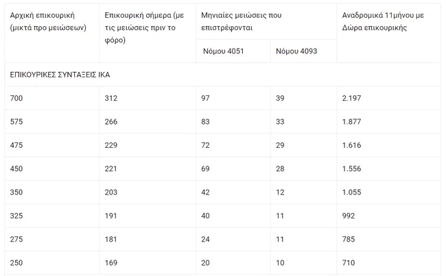 - Συνταξιούχος ΙΚΑ που είχε επικουρική 700 ευρώ και σήμερα παίρνει 312 ευρώ δικαιούται από τις μειώσεις των Νόμων 4093 και 4051 αναδρομικά 2.197 ευρώ.