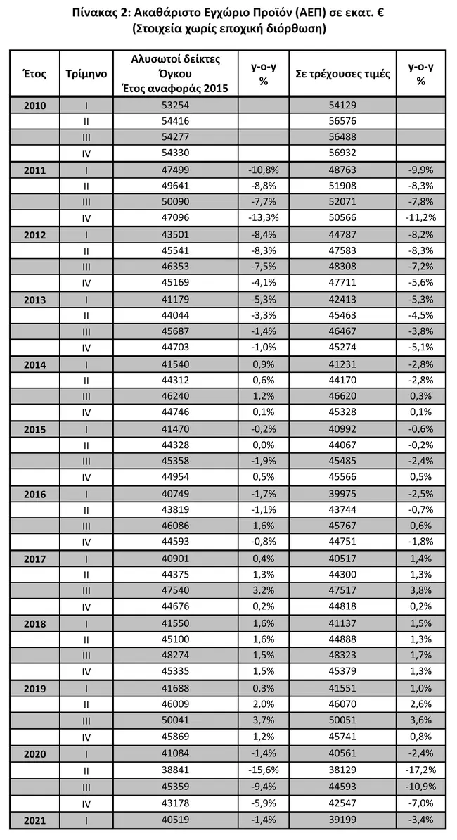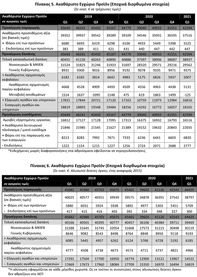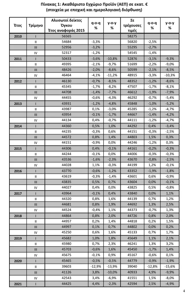 Μείωση της τάξης του 2,3% παρουσίασε το ΑΕΠ στο πρώτο τρίμηνο του 2021 -την περίοδο που η χώρα βρισκόταν σε ολικό lockdown-, σύμφωνα με τα προσωρινά στοιχεία που παρουσίασε η ΕΛΣΤΑΤ. Παράλληλα σε σύγκριση με το τελευταίο τρίμηνο του 2020 παρατηρήθηκε ανάπτυξη που φτάνει στο 4,4%.