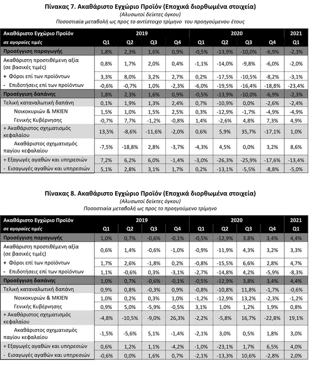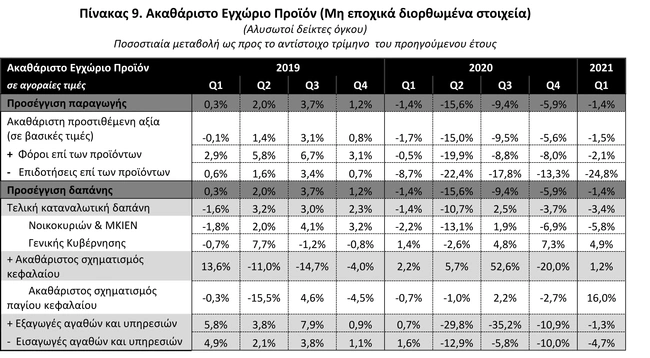 - Η συνολική τελική καταναλωτική δαπάνη παρουσίασε μείωση 2,4%. Η κατανάλωση των νοικοκυριών μειώθηκε 4,9%, ενώ αυτή της Γενικής Κυβέρνησης, λόγω και των μέτρων στήριξης, αυξήθηκε 4,9%.