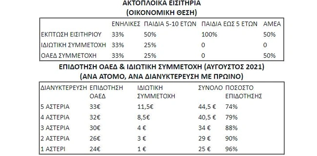 - Επιδότηση ΟΑΕΔ: 720 ευρώ (2 δίκλινα Χ 60 ευρώ/ημέρα Χ 6 διανυκτερεύσεις)
