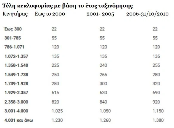 Τέλη κυκλοφορίας: Τα ποσά που αντιστοιχούν στα οχήματα