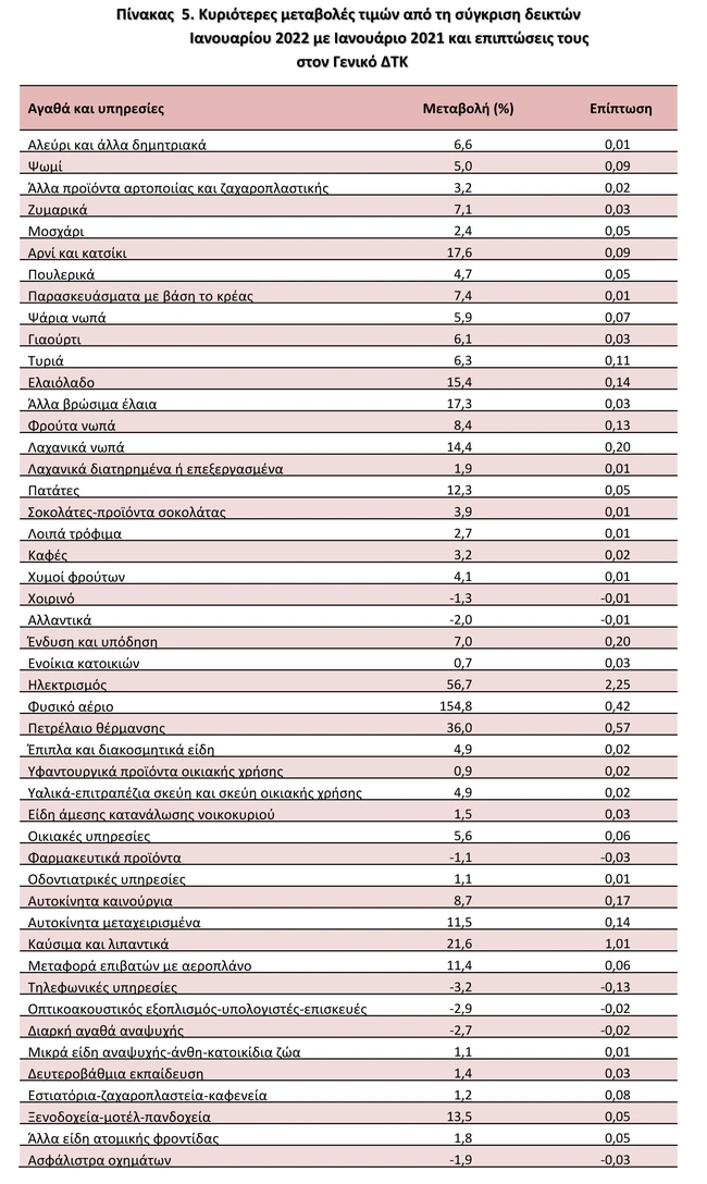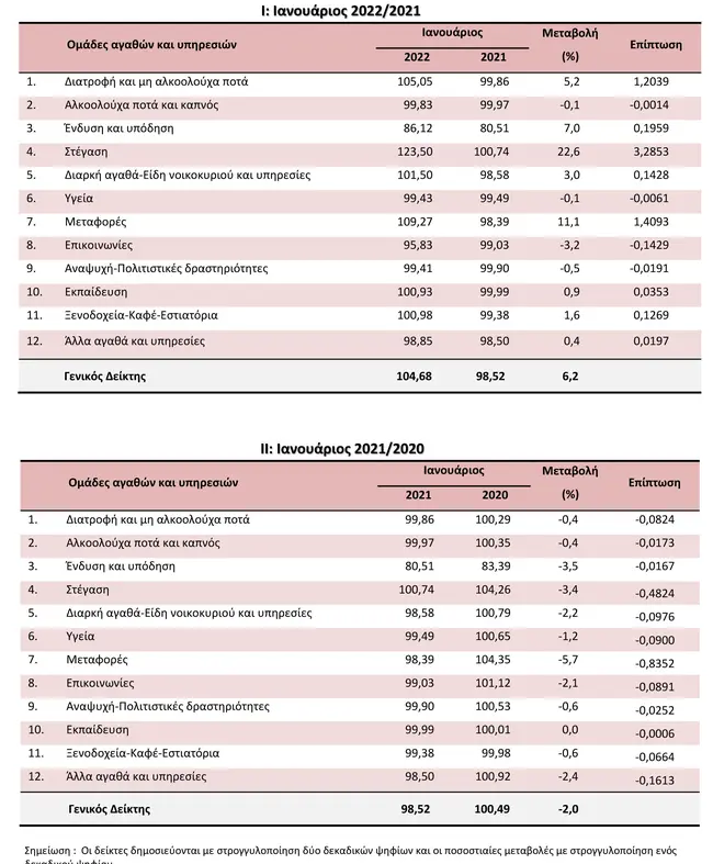Η αύξηση του Γενικού ΔΤΚ κατά 6,2% τον μήνα Ιανουάριο 2022, σε σύγκριση με τον αντίστοιχο Δείκτη του Ιανουαρίου 2021, προήλθε κυρίως από τις μεταβολές στις ακόλουθες ομάδες αγαθών και υπηρεσιών: