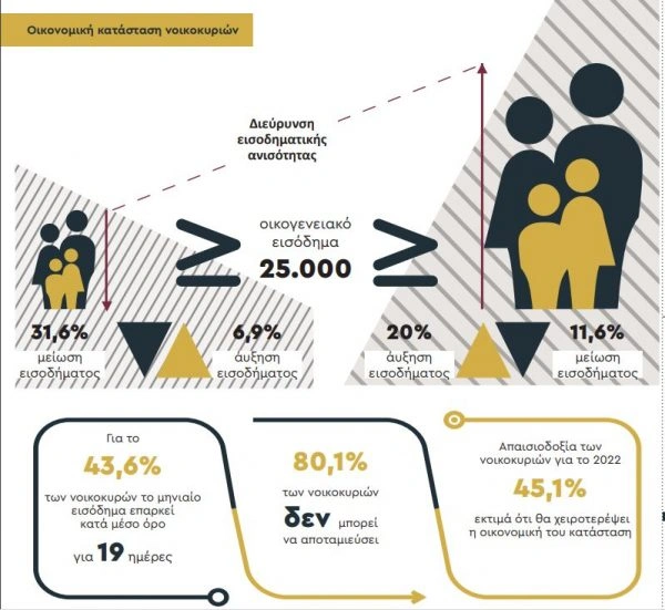 - Ωστόσο, διευρύνθηκε η εισοδηματική ανισότητα μεταξύ των χαμηλών και μεσαίων εισοδηματικά νοικοκυριών έναντι των υψηλών εισοδηματικά νοικοκυριών. Συγκεκριμένα, το 31,6% των νοικοκυριών με εισόδημα έως 25.000 € δήλωσε πως το εισόδημά του μειώθηκε το 2021, έναντι μόλις του 6,9% που δήλωσε ότι αυξήθηκε. Στον αντίποδα το 20% των νοικοκυριών με εισόδημα πάνω από 25.000 € δήλωσε πως το εισόδημά του αυξήθηκε το 2021, έναντι του 11,6% που δήλωσε πως το εισόδημά του μειώθηκε. Επίσης, μόνο 2 στα 10 νοικοκυριά διαβιούν με ετήσιο εισόδημα πάνω από 25.000€.