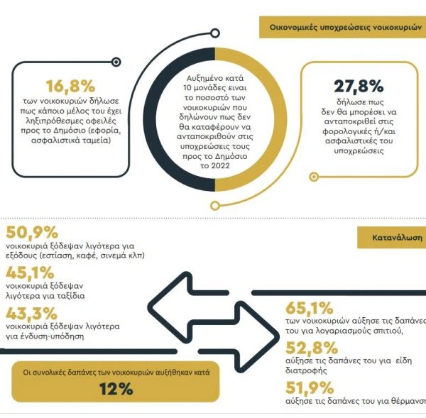 Ακόμη, για 4 στα 10 νοικοκυριά ο μισθός ή η σύνταξη εξανεμίζεται μέχρι τις 19 του μήνα και, παρά τη μείωση των νοικοκυριών με ληξιπρόθεσμες οφειλές προς την εφορία ή/και τα ασφαλιστικά ταμεία, περίπου 3 στα 10 νοικοκυριά δεν θα μπορέσουν να ανταποκριθούν στις υποχρεώσεις αυτές το 2022.