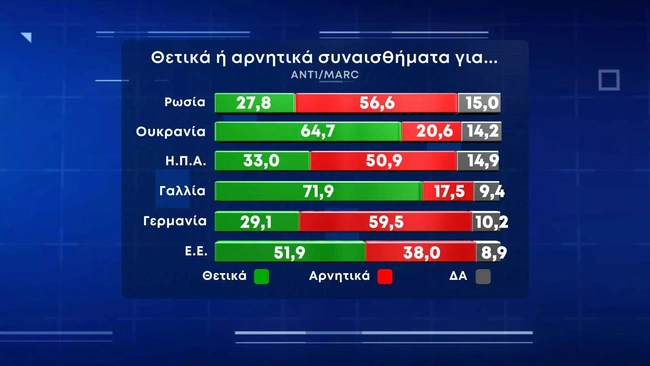 Αναφορικά με τον πόλεμο και τις «συμπάθειες» των πολιτών το 64,7% έχει θετικά αισθήματα για την Ουκρανία έναντι μόλις 27,8% που βλέπει θετικά τη Ρωσία.