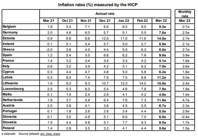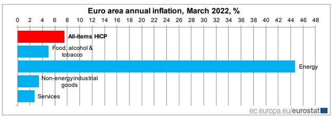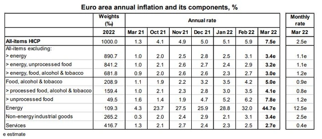 Ο πληθωρισμός στην Ευρωζώνη εκτινάχθηκε στο 7,5% από 5,9% τον Φεβρουάριο, όπως εκτιμά η Eurostat. Η ενέργεια αναμένεται να έχει τον υψηλότερο ετήσιο ρυθμό τον Μάρτιο (44,7%, έναντι 32,0% τον Φεβρουάριο), και ακολουθούν τα τρόφιμα, το αλκοόλ και ο καπνός (5,0%, έναντι 4,2%), μη ενεργειακά βιομηχανικά αγαθά (3,4%, έναντι 3,1%) και υπηρεσίες (2,7%, σε σύγκριση με 2,5%).