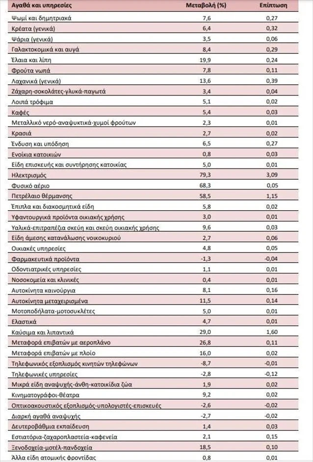 - 29,9% στην ομάδα Στέγαση, λόγω αύξησης κυρίως των τιμών σε: ενοίκια κατοικιών, είδη επισκευής και συντήρησης κατοικίας, ηλεκτρισμό, φυσικό αέριο, πετρέλαιο θέρμανσης.